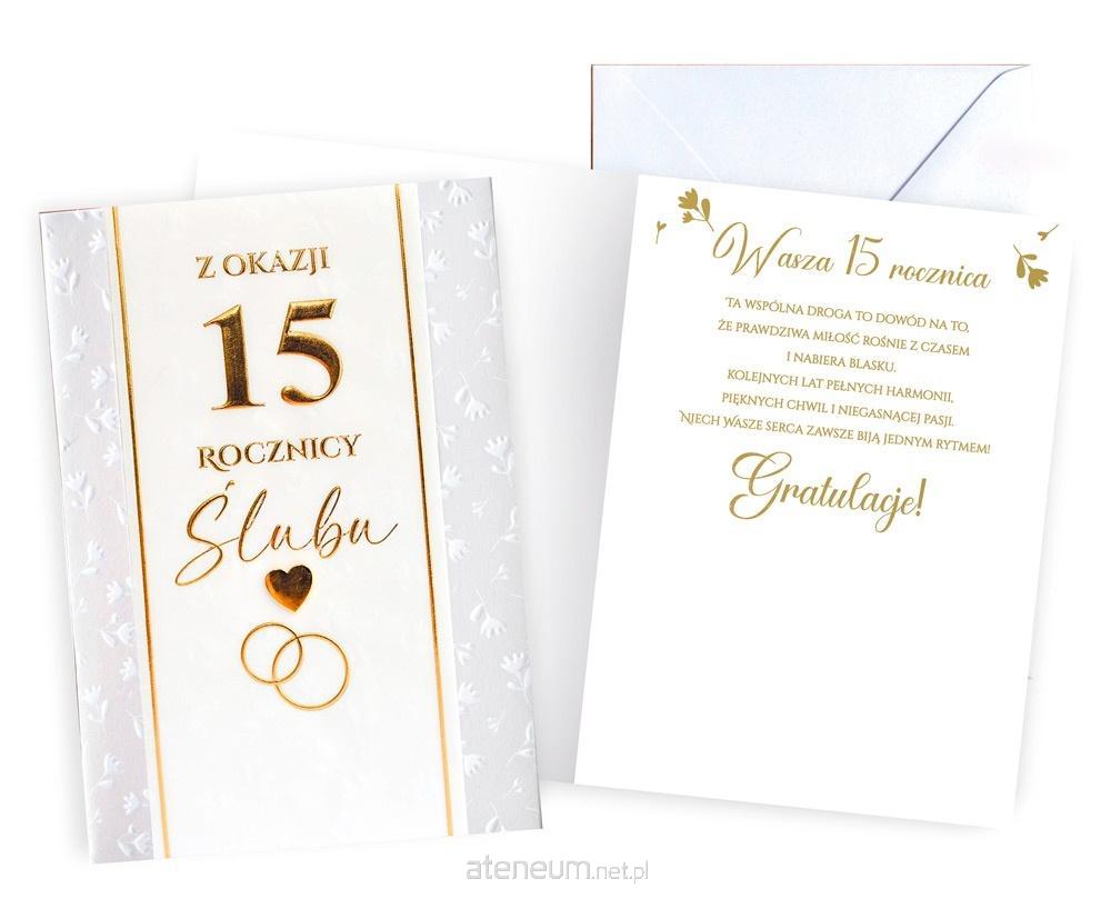 Kartka Dream Cards "Z okazji 15. rocznicy ślubu" DK-1336 Kartka B6 z ozdobnej serii Dream Cards - nieduża, ale robi wrażenie dzięki atrakcyjnej kolorystyce i ciekawym zdobieniom. To idealny wybór łączący przyjazną cenę z jakością. Cechy szczególne: wielkość: B6, 16.6 x 11.7 cm po złożeniu, koperta: w zestawie, kolorowa, zdobienia: kolorowe, różnorodne, bogate (w zależności od wzoru: przyklejane dekoracje, elementy biżuteryjne, odstawniki, metaliczne folie, tłoczenia itp.), okazja: Rocznica