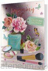 Kartka jest bogato i różnorodnie zdobiona (zależnie od wzoru: metaliczna folia, lakier perłowy,