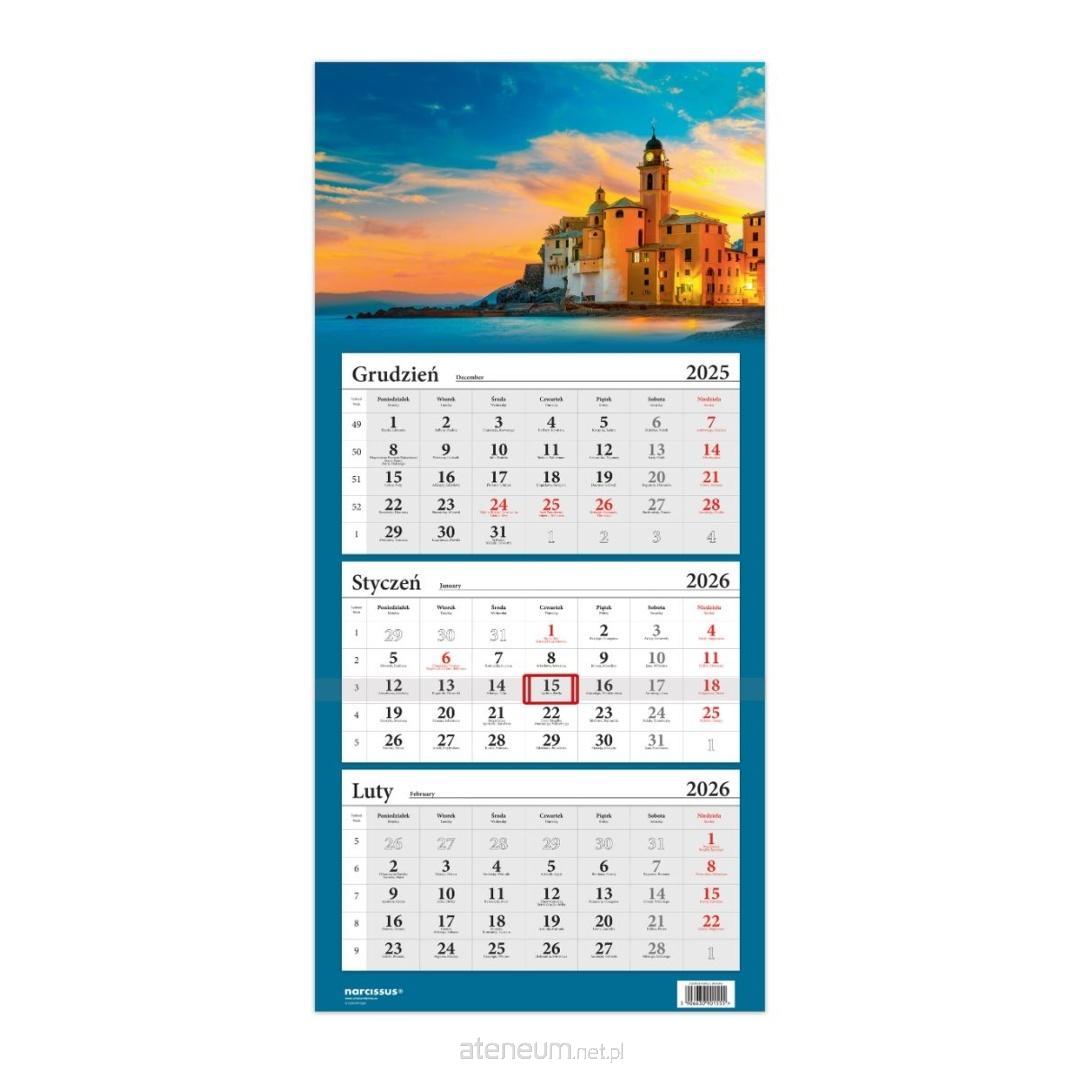 Klasyczny kalendarz trójdzielny na 2026 rok, podłużny, z opaską z przesuwnym okienkiem do zaznaczenia wskazanego dnia. Kalendarz można złożyć w 3 miejscach. Zawiera 3 odrębne, zrywane kalendaria po 12 kartek. Kalendarz jest zapakowany w folię ochronną.