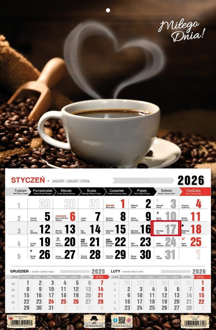 Kalendarz 2026 Trójdzielny JEDNODZIELNY. Format 315/480mm. Układ kalendariów jednodzielny z przesuwnym okienkiem. Główka z otworem wierconym. Dodatkowo nazwy miesiąca i dni tygodnia w języku Ukraińskim, Angielskim i Niemieckim. Kalendarium dodatkowo zawiera fazy księżyca i znaki zodiaku. Dużo miejsca do notowania, czytelne duże litery i cyfry.