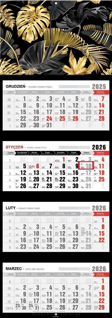 Kalendarz 2026 CZTERODZIELNY/ CZTEROMIESIĘCZNY /KWARTALNY PREMIUM Z WYPUKŁĄ GŁÓWKĄ. Format 315/890mm. Trzy komplety klasycznych kalendariów z przesuwnym okienkiem. Główka wypukła z otworem wierconym. Dodatkowo nazwy miesiąca i dni tygodnia w języku Ukraińskim, Angielskim i Niemieckim. Kalendarium dodatkowo zawiera fazy księżyca i znaki zodiaku. Dużo miejsca do notowania, czytelne duże litery i cyfry. Tematyka krajobrazy, pejzaże, zwierzęta, widoki, glamour, kawa. Nowoczesne i klasyczne wzornictwo, dopracowane wzory, czytelne kalendarium. Praktyczny i elegancki kalendarz który sprawdzi się zarówno w domu, biurze jak i innych pomieszczeniach.