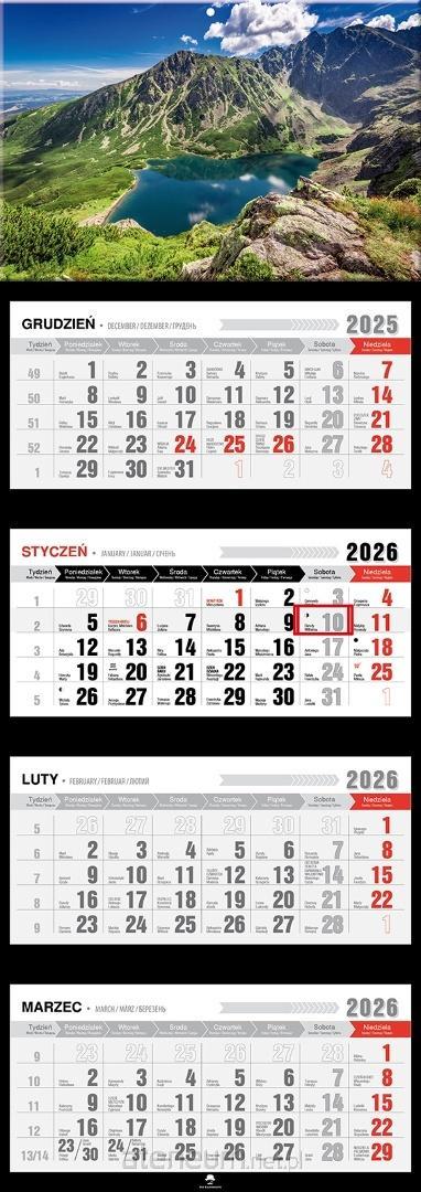 Kalendarz 2026 CZTERODZIELNY/ CZTEROMIESIĘCZNY /KWARTALNY PREMIUM Z WYPUKŁĄ GŁÓWKĄ. Format 315/890mm. Trzy komplety klasycznych kalendariów z przesuwnym okienkiem. Główka wypukła z otworem wierconym. Dodatkowo nazwy miesiąca i dni tygodnia w języku Ukraińskim, Angielskim i Niemieckim. Kalendarium dodatkowo zawiera fazy księżyca i znaki zodiaku. Dużo miejsca do notowania, czytelne duże litery i cyfry. Tematyka krajobrazy, pejzaże, zwierzęta, widoki, glamour, kawa. Nowoczesne i klasyczne wzornictwo, dopracowane wzory, czytelne kalendarium. Praktyczny i elegancki kalendarz który sprawdzi się zarówno w domu, biurze jak i innych pomieszczeniach.