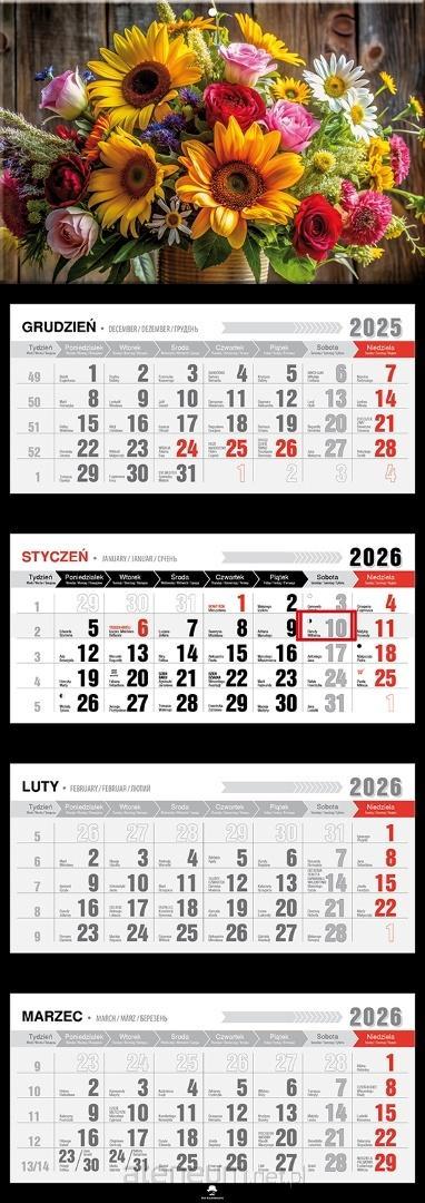 Kalendarz 2026 CZTERODZIELNY/ CZTEROMIESIĘCZNY /KWARTALNY PREMIUM Z WYPUKŁĄ GŁÓWKĄ. Format 315/890mm. Trzy komplety klasycznych kalendariów z przesuwnym okienkiem. Główka wypukła z otworem wierconym. Dodatkowo nazwy miesiąca i dni tygodnia w języku Ukraińskim, Angielskim i Niemieckim. Kalendarium dodatkowo zawiera fazy księżyca i znaki zodiaku. Dużo miejsca do notowania, czytelne duże litery i cyfry. Tematyka krajobrazy, pejzaże, zwierzęta, widoki, glamour, kawa. Nowoczesne i klasyczne wzornictwo, dopracowane wzory, czytelne kalendarium. Praktyczny i elegancki kalendarz który sprawdzi się zarówno w domu, biurze jak i innych pomieszczeniach.