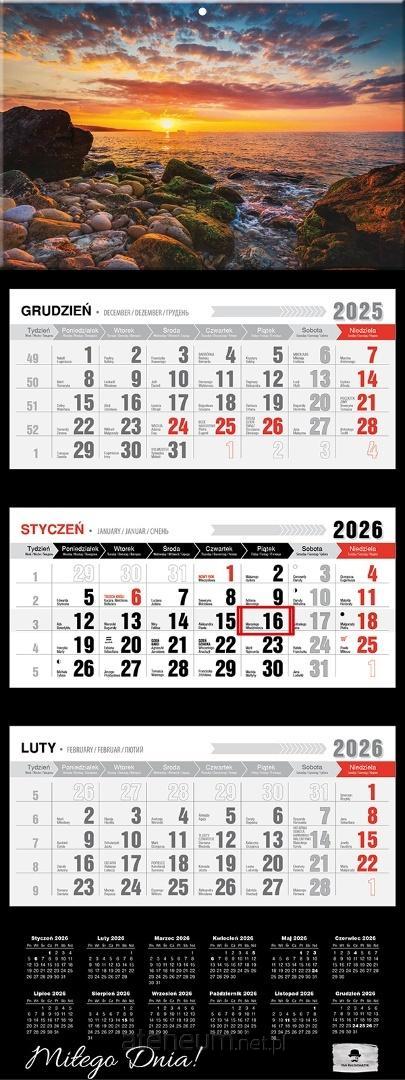 Kalendarz Trójdzielny PREMIUM Z WYPUKŁĄ GŁÓWKĄ. Format 315/810mm. Trzy komplety klasycznych kalendariów z przesuwnym okienkiem. Główka z otworem wierconym. Dodatkowo nazwy miesiąca i dni tygodnia w języku Ukraińskim, Angielskim i Niemieckim. Kalendarium dodatkowo zawiera fazy księżyca i znaki zodiaku. Dużo miejsca do notowania, czytelne duże litery i cyfry. DODATKOWO PRZEDŁUŻONE PLECKI KOLOREM DOPASOWANE DO WZORU ZE SKRÓCONYM KALENDARIUM NA ROK 2026.