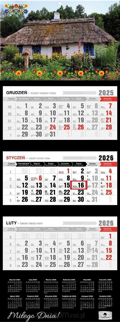 Kalendarz Trójdzielny PREMIUM Z WYPUKŁĄ GŁÓWKĄ. Format 315/810mm. Trzy komplety klasycznych kalendariów z przesuwnym okienkiem. Główka z otworem wierconym. Dodatkowo nazwy miesiąca i dni tygodnia w języku Ukraińskim, Angielskim i Niemieckim. Kalendarium dodatkowo zawiera fazy księżyca i znaki zodiaku. Dużo miejsca do notowania, czytelne duże litery i cyfry. DODATKOWO PRZEDŁUŻONE PLECKI KOLOREM DOPASOWANE DO WZORU ZE SKRÓCONYM KALENDARIUM NA ROK 2026