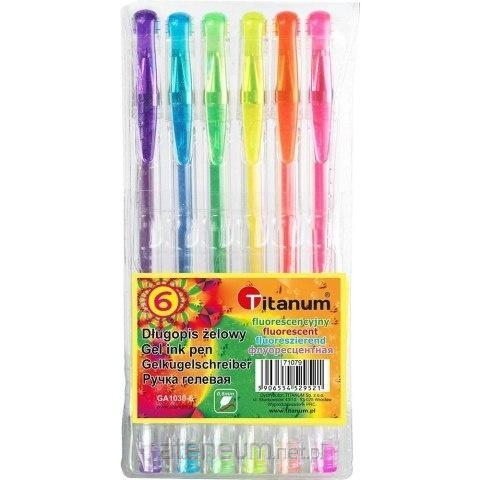 Komplet żelowych długopisów w 6 fluorescencyjnych kolorach. Przezroczysta zatyczka, klips w kolorze wkładu. Grubość linii pisania: 0,8 mm. Opakowanie: 6 szt.