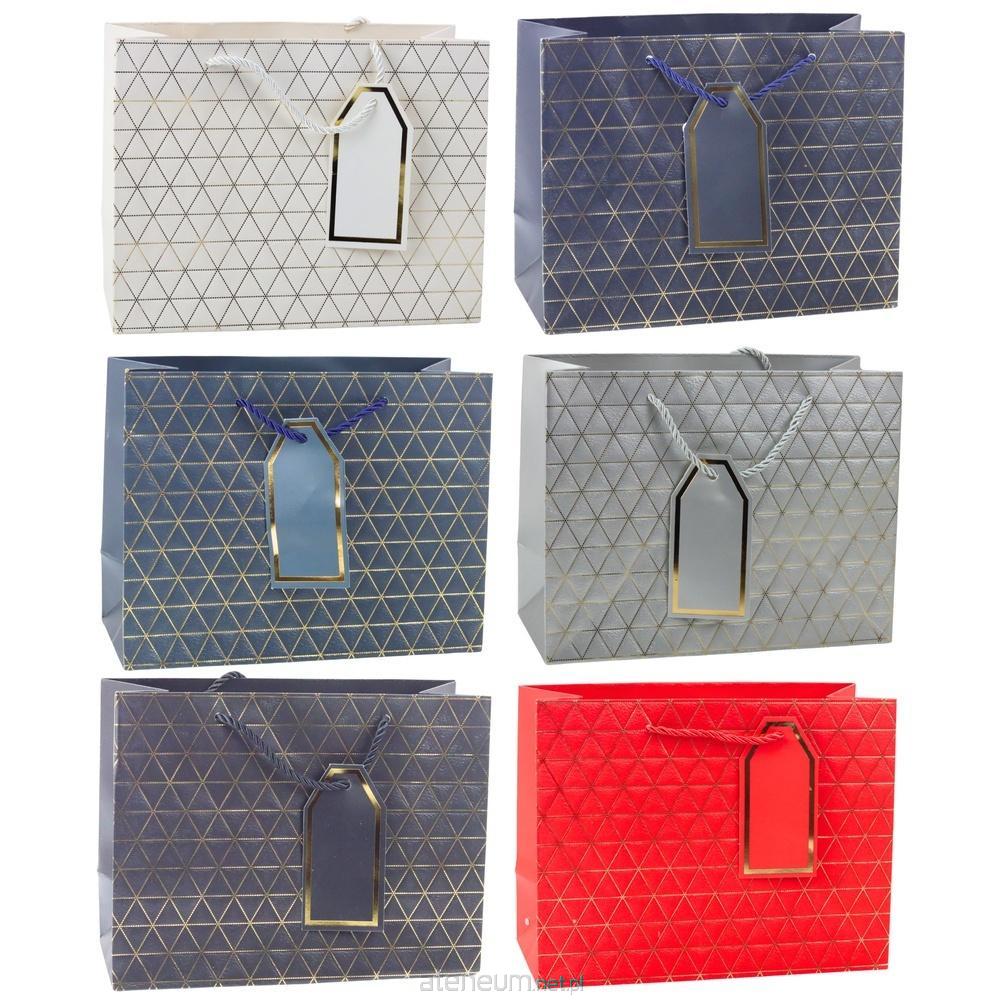 Nowoczesna torba prezentowa w geometryczny wzór to eleganckie i praktyczne rozwiązanie do pakowania upominków. Zdobiona złotymi liniami tworzącymi regularne trójkątne motywy, umieszczone na tle w sześciu stylowych wariantach kolorystycznych - białym, granatowym, grafitowym, srebrnym, szarym i czerwonym - prezentuje się wyjątkowo estetycznie, a jednocześnie nowocześnie i uniwersalnie. Dzięki temu świetnie wpisuje się zarówno w klasyczne, jak i bardziej minimalistyczne aranżacje prezentowe. Do każdej torby dołączona jest elegancka zawieszka, która pozwala na dodanie imienia obdarowywanej osoby, dedykacji lub krótkiego życzenia, co podnosi jej walory dekoracyjne.