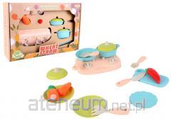 Kompleksowy zestaw kuchenny: Zawiera wszystko, czego potrzebuje mały kucharz: dwupalnikową kuchenkę, patelnię z pokrywką, garnek, oraz zestaw narzędzi kuchennych.