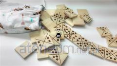 Mała wersja domina double 6 zawiera 28 klocków z czarnymi oczkami i wirującymi elementami i jest dostarczana w drewnianym pudełku z przesuwaną pokrywką. Wymiary klocków: 41 x 20 x 7 mm.