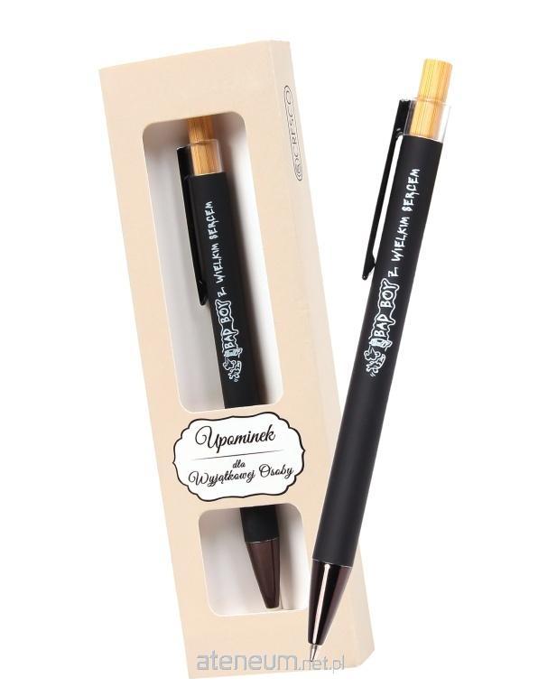 Metalowy, automatyczny długopis DYPLOMAT z nadrukiem BAD BOY z wielkim sercem - jako prezent na różne okazje dla chłopaka, nie tylko na Dzień Chłopaka. Długopis koloru czarnego z wymiennym wkładem typu zenith. Zapakowany w prezentowe etui.