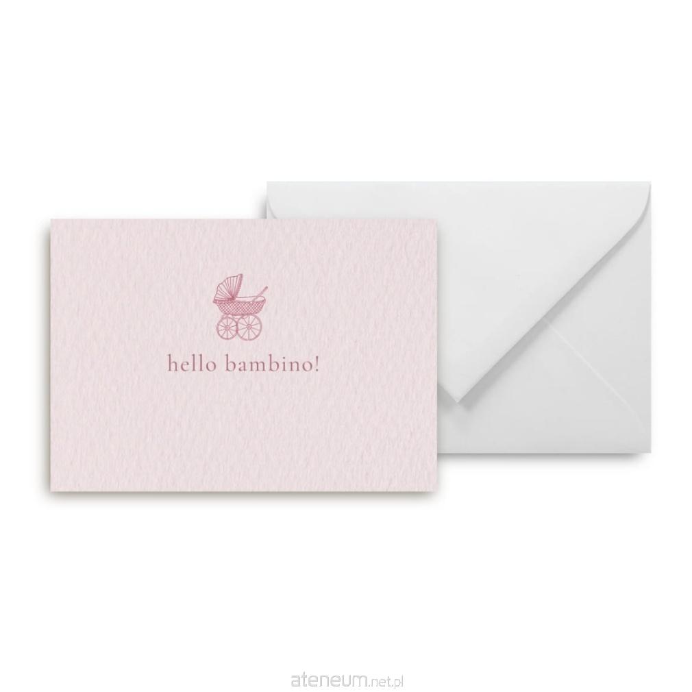 Delikatna, różowa mini kartka z napisem hello bambino to uroczy sposób na powitanie nowego