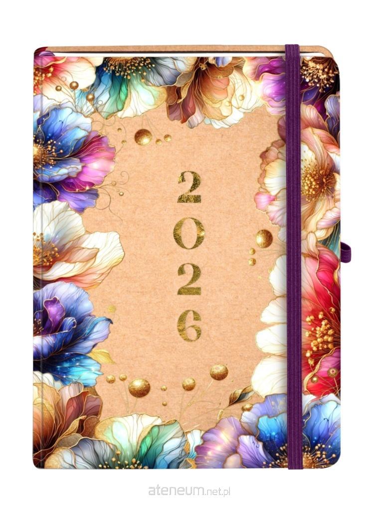Kolekcja: Kraft, format: A5, wymiary okładki: 207x141 mm, układ: dzień na stronie, ilość stron: 352, oprawa: twarda, materiał: papier, gramatura papieru: 80g, kolor papieru: chamoise , dodatki: plan roku 2026, ważne wydarzenia, skorowidz adresowy, notatki, pionowa gumka zamykająca: czarna, wstążka: czarna, gumka na długopis: nie, zaokrąglone rogi: tak, wyklejka: czarna, koperta: nie, dostępne kolory: czarny, złoty, kwiaty