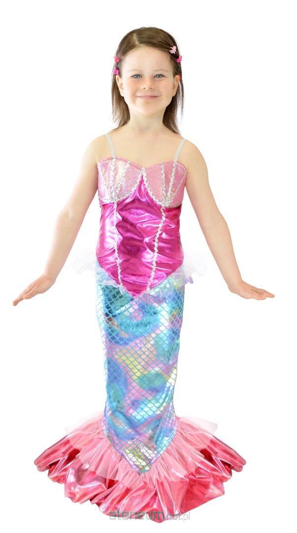"Przebranie dla dziewczynki - syrenka. Strój składa się z długiej sukienki na ramiączkach. Materiał ładnie się mieni. Dół sukienki imituje syreni ogon. Posiada dekoracyjne falbanki. Strój na bal przebierańców, zabawy karnawałowe w szkole i przedszkolu, zabawę tematyczną.