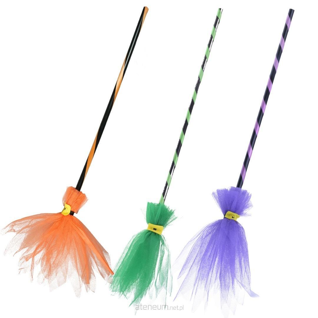 Kolorowa miotła - niezbędny dodatek do pełnej charakteryzacji czarownicy. Bardzo lekka i wygodna, zakończona kolorową siatką. Może służyć zarówno jako dodatek do stroju, jak i element wystroju wnętrza na Halloween i inne imprezy tematyczne.