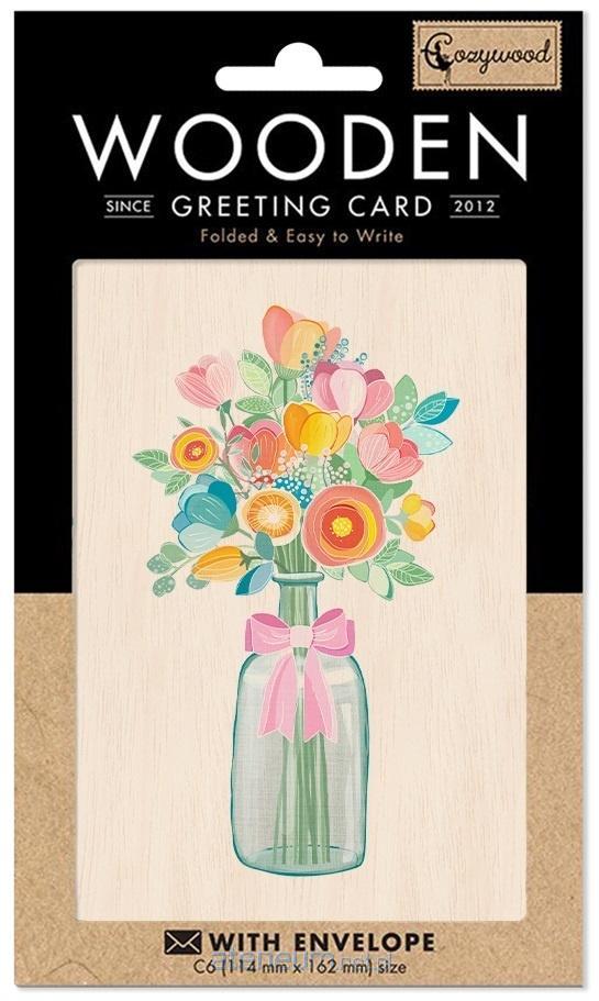 Drewniany karnet w formacie C6 z kopertą. W środku nie zawiera tekstu. Ten karnet jest w 100% biodegradowalny, wykonany przy użyciu minimalnego nakładu energii, gazu i wody. Jego wytworzenie zużywa 5 razy mniej drewna niż wykonanie karnetu papierowego. Karnet posiada certyfikat FSC, gwarantujący odpowiedzialne pozyskiwanie drewna. Wyprodukowany na Litwie.
