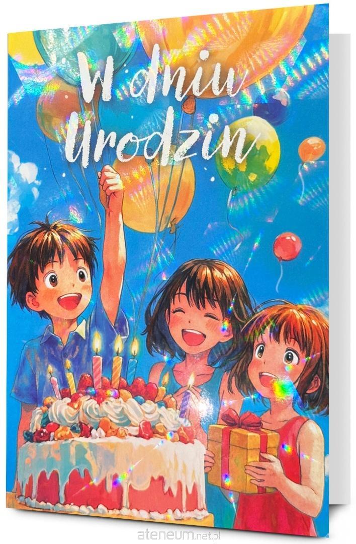 Kartka jest zdobiona opalizującą folią holograficzną, zawiera życzenia oraz kolorowy środek. W zestawie znajduje się koperta, kolorystycznie uzupełniająca się z kartką. Format złożonej kartki: B6