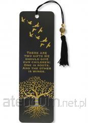 Pozłacana, papierowa zakładka do książki z ozdobną wstążką.