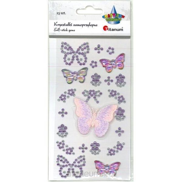 Kryształki samoprzylepne motyle mix (w tym z kryształków 36x28mm, akrylowe 32x18mm, z muliny na tkaninie 54x45mm) fioletowe 23szt.