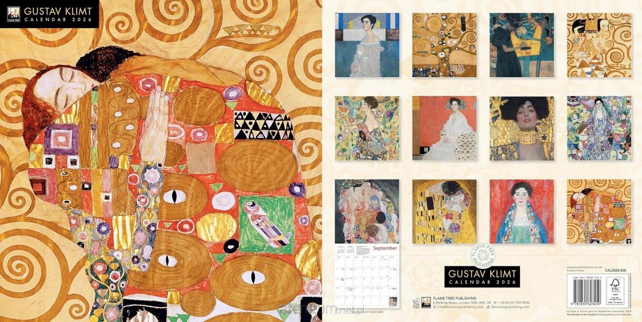 Kalendarz ścienny o wymiarach 300 300 mm, zatytułowany Gustav Klimt Wall Calendar 2026 (Art Calendar), wydany przez Flame Tree Publishing. Motywem przewodnim są najbardziej znane dzieła Gustava Klimta, austriackiego malarza symbolizmu i secesji, którego sztuka zachwyca bogactwem złota, ornamentyki i ekspresji. Na każdej z 12 stron znajduje się jedno z jego słynnych malarstw, takich jak "The Kiss", "Fulfilment" czy "Portrait of Adele Bloch-Bauer I", a pod reprodukcją umieszczono krótki opis przybliżający znaczenie i historię obrazu.