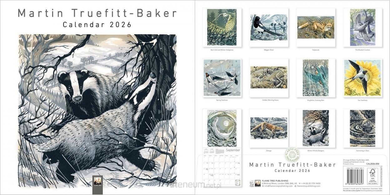Kalendarz ścienny o wymiarach 300 300 mm, zatytułowany Martin Truefitt-Baker Wall Calendar 2026 (Art Calendar), wydany przez Flame Tree Publishing. Motywem przewodnim są linoryty i grafiki natury autorstwa Martina Truefitt-Bakera, artysty, który w swoich pracach uchwyca zwierzęta, rośliny i klimat krajobrazów Wielkiej Brytanii. Na każdej z 12 stron prezentowany jest jeden z jego artystycznych motywów - od sowy, lisa, borsuka, wydry po jaskółki - a poniżej znajduje się krótki tekst autorstwa artysty przybliżający proces powstawania dzieła i jego obserwacje natury.