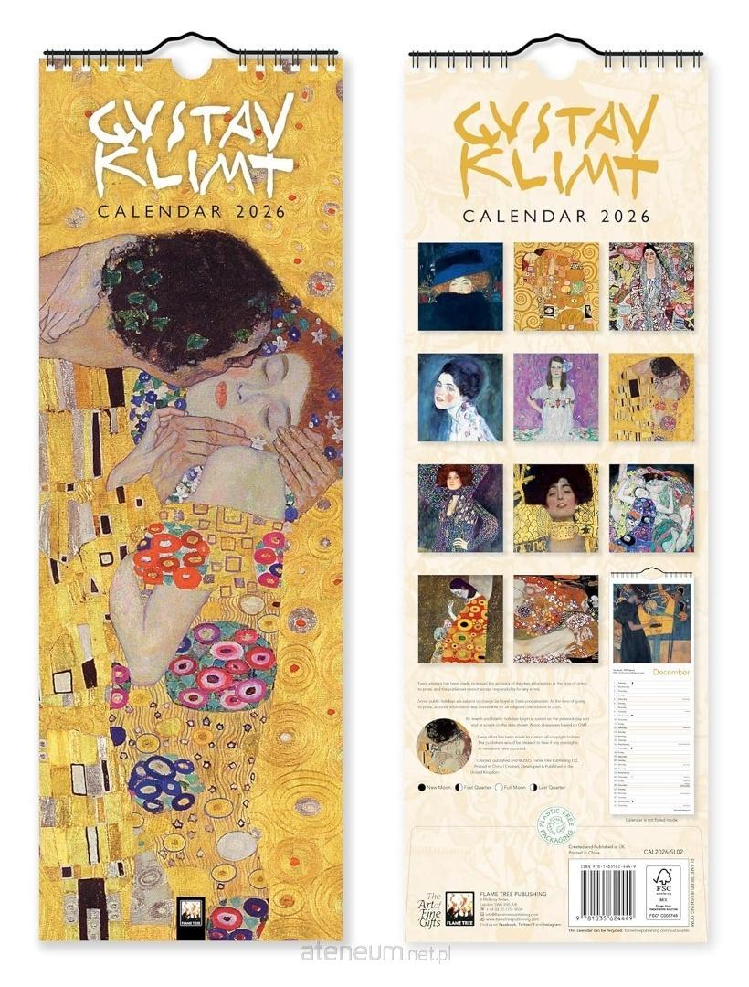 Kalendarz ścienny w formacie 420 145 mm, zatytułowany Gustav Klimt Slim Calendar 2026 (Art Calendar), wydany przez Flame Tree Publishing. Motywem przewodnim są najbardziej rozpoznawalne dzieła austriackiego malarza Gustav Klimt - od złotych płaskorzeźb i ornamentalnych kompozycji po eleganckie portrety kobiet. Na każdej z 12 stron znajduje się jedno z jego dzieł, a pod ilustracją zamieszczono krótki tekst przybliżający kontekst artystyczny i historyczny pracy.