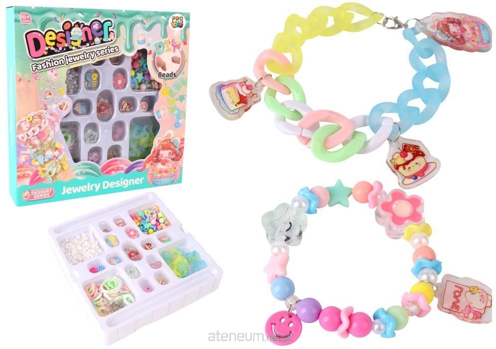 Zestaw inspirowany jest stylem sweet candy pełen jest barw, pozytywnej energii i uroku. Dziecko może wykonać zarówno delikatne, perełkowe ozdoby, jak i efektowne, łańcuchowe bransoletki z zawieszkami w kształcie tortów i babeczek. Wszystkie elementy są lekkie, przyjemne w dotyku i bezpieczne w użytkowaniu.