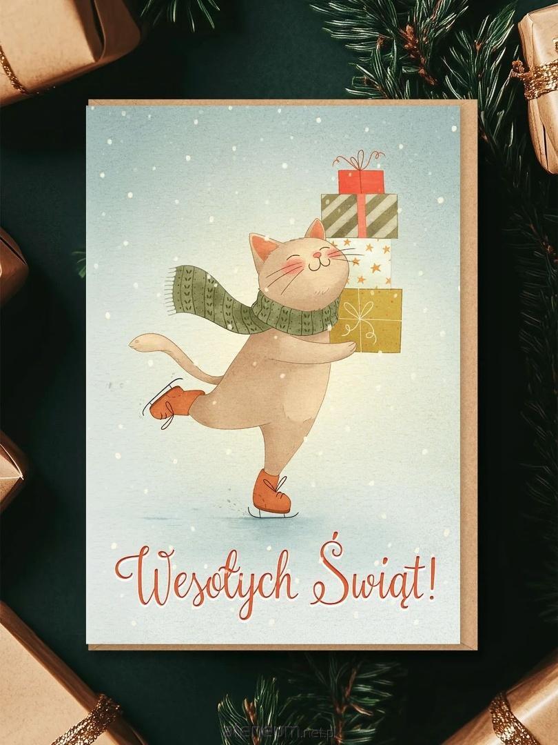 Kartka bożonarodzeniowa WESOŁYCH ŚWIĄT / KOT Z PREZENTAMI