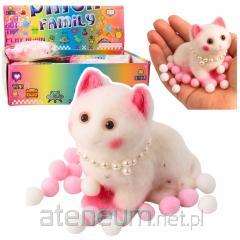 Kotek został pokryty imitacją puszystego futerka, dzięki czemu wygląda wyjątkowo realistycznie i przytulnie. Jego wygląd uzupełniają biało-różowe pomponiki oraz perłowy naszyjnik, które nadają zabawce eleganckiego i słodkiego charakteru.
