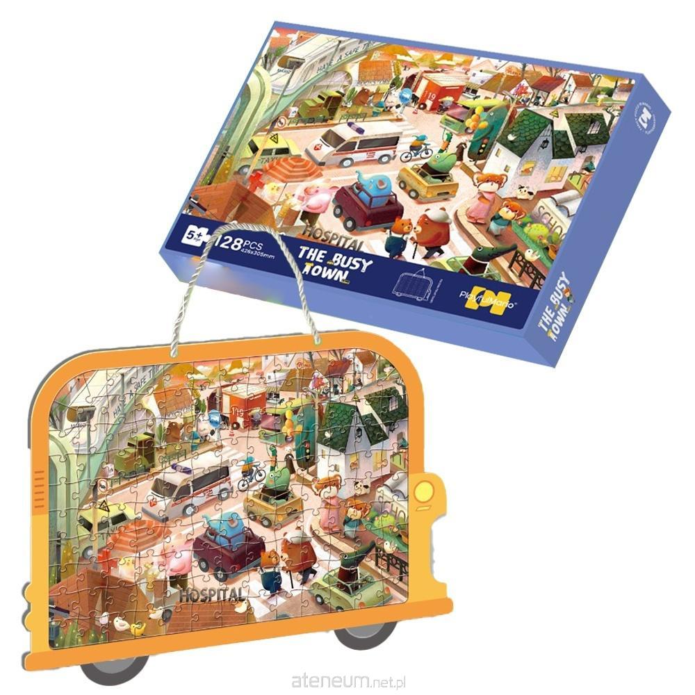 Miasteczko; w zestawie ramka w kształcie samochodu, samoprzylepny papier i sznurek, po ułożeniu puzzle można powiesić jako obrazek na ścianie