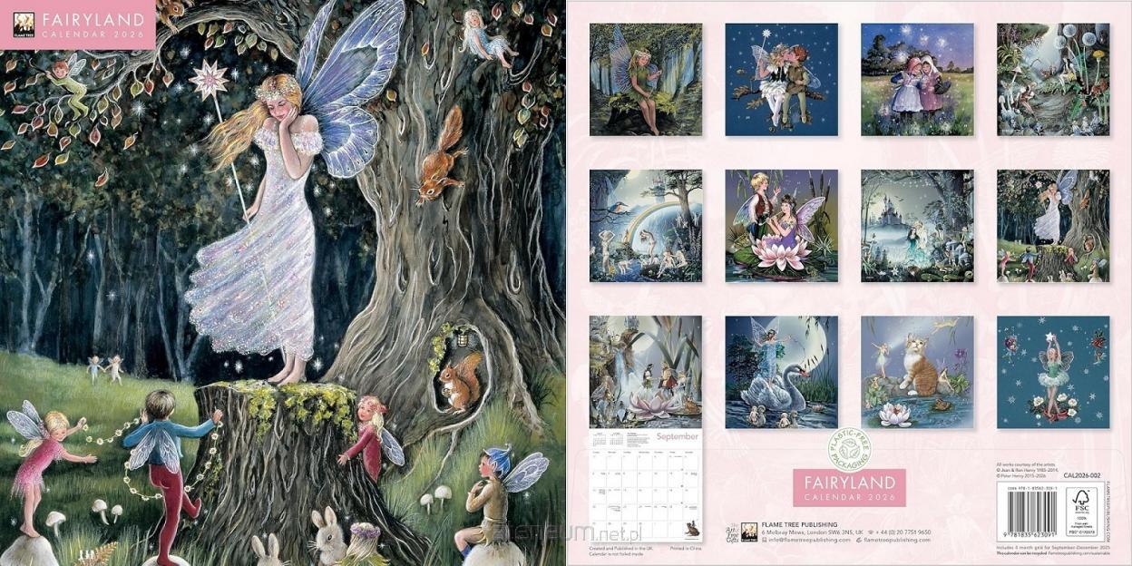 Kalendarz ścienny o wymiarach 300 300 mm, zatytułowany Fairies Wall Calendar 2026 (Art Calendar), wydany przez Flame Tree Publishing. Motywem przewodnim są delikatne, magiczne ilustracje wróżek i baśniowych postaci, które przenoszą w świat fantazji pełen uroku, subtelnej tajemnicy i lekkiej, bajkowej atmosfery. Każdy miesiąc zdobi osobna ilustracja przedstawiająca wróżki w ich zaczarowanych światach, otoczone kwiatami, światłem księżyca i eterycznymi pejzażami.