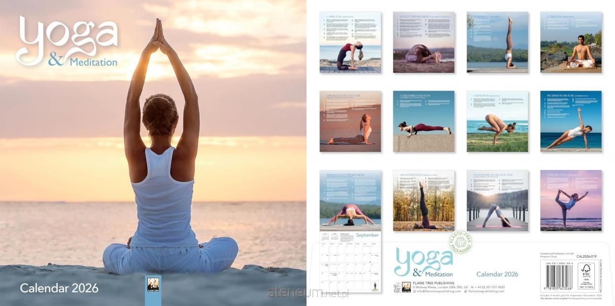 Kalendarz ścienny o wymiarach 300 300 mm, zatytułowany Yoga Wall Calendar 2026 (Art Calendar), wydany przez Flame Tree Publishing. Motywem przewodnim są spokojne i harmonijne ilustracje inspirowane praktyką jogi każda z 12 stron ukazuje delikatne, wyciszone sceny, w których ciała przyjmują łagodne, harmonijne formy, otoczone subtelną atmosferą równowagi i wewnętrznego spokoju.