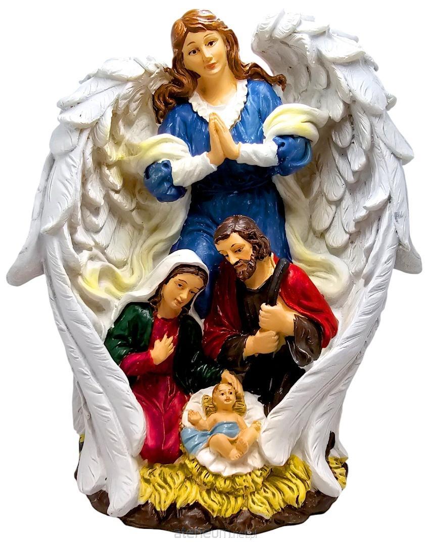 Elegancka i urocza Szopka Betlejemska wykonana z trwałej żywicy syntetycznej, która doskonale oddaje scenę Narodzenia Pańskiego. Figurka przedstawia Anioła Stróża z pięknymi, ozdobnymi skrzydłami, które delikatnie osłaniają Świętą Rodzinę. Ta kolorowa i pięknie wykonana szopka, mimo braku Gwiazdy Betlejemskiej, silnie symbolizuje Boską opiekę i miłość.