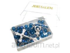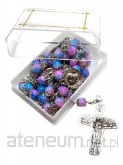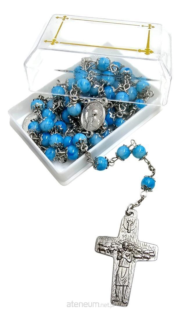 Różaniec został wykonany z lśniących, szklanych koralików o średnicy 6 mm. Każdy koralik zachwyca swoim melanżowo-niebieskim odcieniem i jest misternie zdobiony metalowym ażurem, co nadaje całości niezwykłej elegancji.