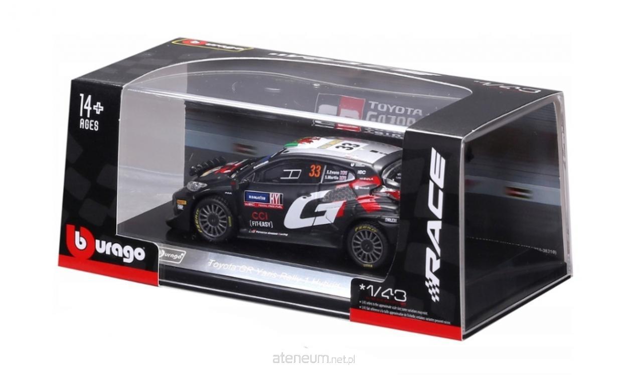 Toyota GR Yaris Rally1 Hybrid #33 - Elfyn Evans, Scott Martin oryginalny produkt marki Bburago, oficjalny, licencjonowany wzór pojazdu, metalowy model z plastikowymi elementami, perfekcyjne odwzorowanie szczegółów. Model umieszczony na plastikowej podkładce oraz zamknięty w ochronnej gablotce. Wymiary opakowania: szerokość 14,5cm, głębokość 7cm, wysokość 6,5cm. Prezentujemy model Toyoty GR Yaris Rally1 Hybrid #33 w skali 1:43, prowadzonej przez Elfyna Evansa . Ten samochód to prawdziwa ikona Rajdowych Mistrzostw Świata (WRC), łącząca 1,6-litrowy silnik turbo (370+ KM) z innowacyjnym systemem hybrydowym (136 KM). Dzięki napędowi na cztery koła i zaawansowanemu zawieszeniu, Toyota GR Yaris Rally1 Hybrid dominowała na rajdowych trasach, zdobywając liczne zwycięstwa. Ten precyzyjnie wykonany model to hołd dla technologicznego zaawansowania i niezapomnianych chwil wświecie rajdów.