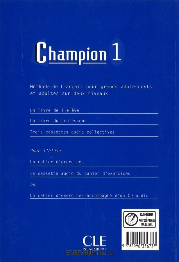 Zeszyt ćwiczeń Champion 1 zawiera również płytę CD przeznaczoną dla ucznia. Zeszyt ćwiczeń jest proponowany dla każdej jednostki, oferując ćwiczenia uzupełniające odpowiadające poziomowi zaawansowanemu i obejmujące słownictwo, gramatykę, rozumienie tekstu pisanego, fonetykę, grafikę, rozumienie tekstu mówionego i pisanie. Transkrypcja nagrań i poprawki do ćwiczeń znajdują się na końcu strony. Z drugiej strony, na końcu strony znajduje się leksykon, który jest przydatny do tłumaczenia na język ojczysty, dzięki czemu staje się on Twoim własnym słownikiem.