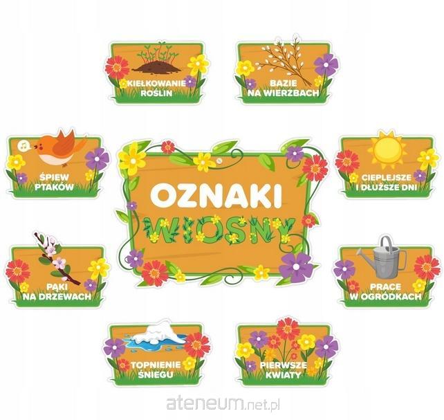 Zestaw składa się z 8 oznak wiosny na tabliczkach oraz 1 głównej tabliczki z napisem OZNAKI WIOSNY.