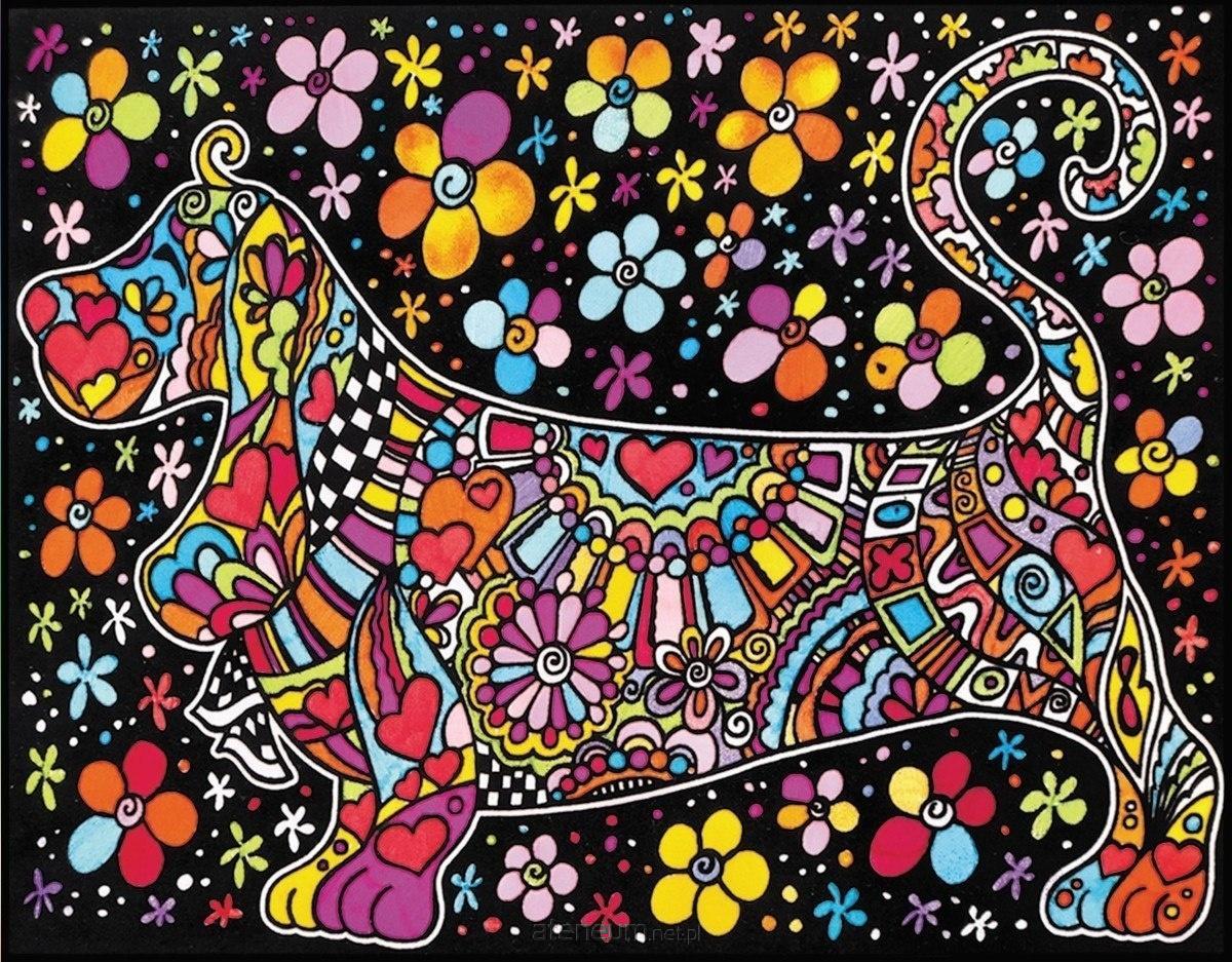 Wypukłe linie ułatwiają nie wychodzenie za linie, a na głębokiej matowej czerni nie widać drobnych potknięć przy kolorowaniu. Welwet nałożony jest na papier przyklejony do sztywnej tektury, dzięki czemu obraz nie wymaga ramki jeśli zdecydujemy się go powiesić na ścianie.