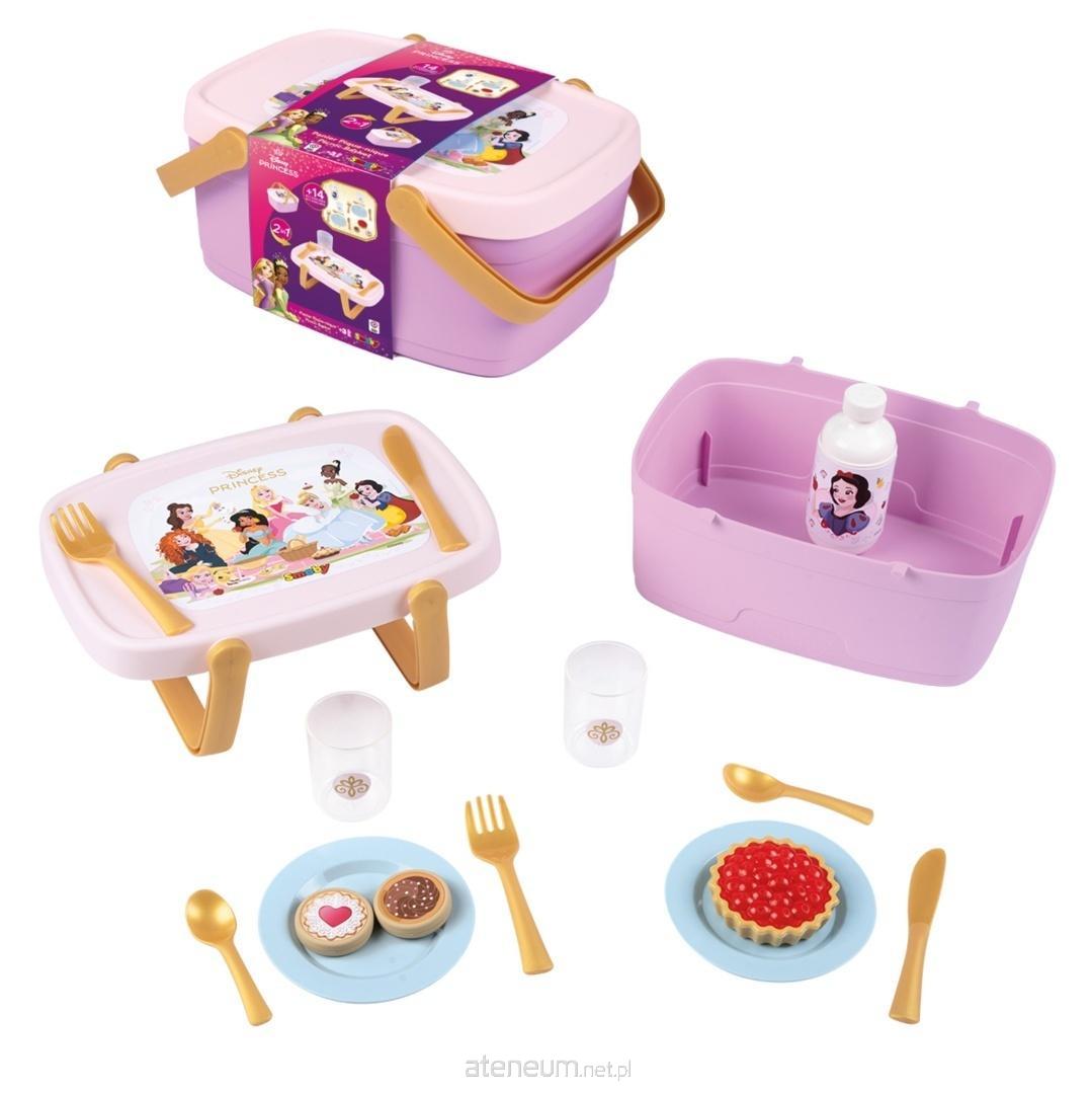 Smoby Disney Princess koszyk piknikowy 2 w 1 \nKoszyk piknikowy i stolik w jednym, wystarczy złożyć uchwyty koszyka aby przygotować funkcjonalny stolik piknikowy. W zestawie 16 akcesoriów w tym: szaszłyk owocowy, naczynia, sztućce, kubki. Wyprodukowano we Francji. Wymiary: 18x25,5x11 cm, 3l+