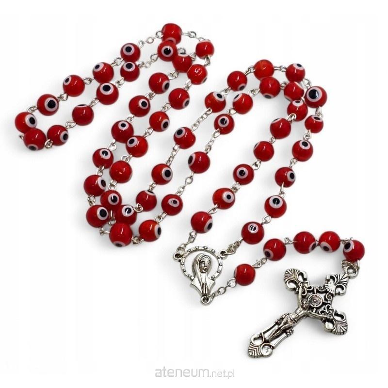 Odkryj niezwykłe piękno tego szklanego różańca, który przyciąga wzrok swoim oryginalnym designem. Czerwone, szklane koraliki, ozdobione małymi czarno-białymi oczkami, tworzą unikalny i efektowny wzór. Piękny łącznik z wizerunkiem Matki Boskiej oraz ażurowy krzyż wykonany z metalu dodają różańcowi elegancji i duchowego charakteru.