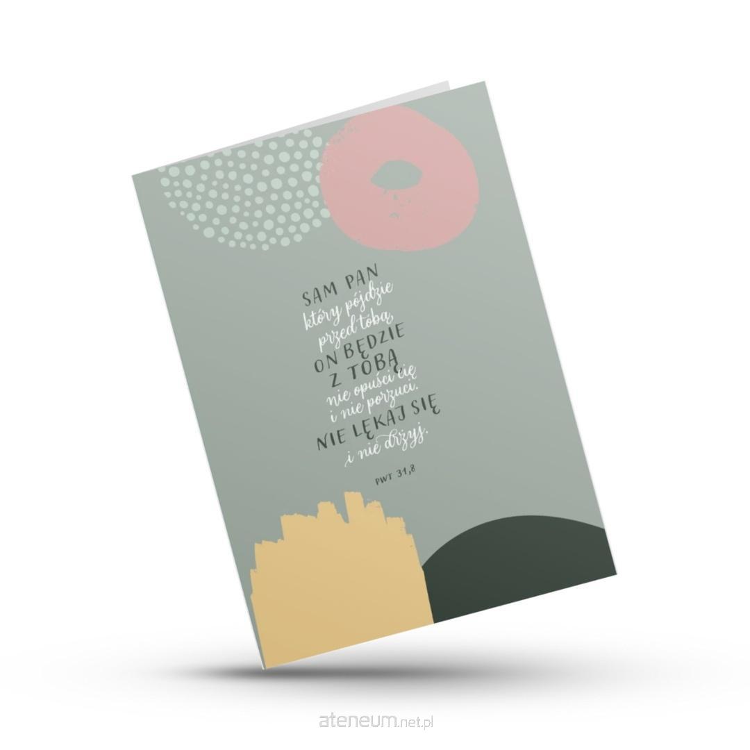 Kartka z cytatem z Księgi Powtórzonego Prawa 31,8 przypomina o Bożej obecności w każdym kroku życia. Nowoczesny, graficzny projekt łączy pastelowe barwy z głębokim przesłaniem wiary i nadziei.