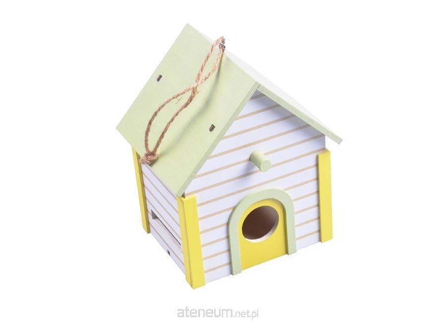 Wiosenna dekoracja drewniana budka dla ptaków do zawieszenia. Budka jest w białym kolorze w żółte paski, z zielonym dachem. Posiada jutowy sznurek do zawieszenia. Można ją również postawić.