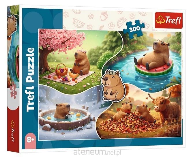 Cztery pory roku z kapibarami to puzzle składające się z 300 elementów przedstawiające urocze kapibary w czterech porach roku, odpoczywające i bawiące się w różnych sceneriach natury. Po ułożeniu układanki powstanie obrazek o wymiarach 600x400 mm.