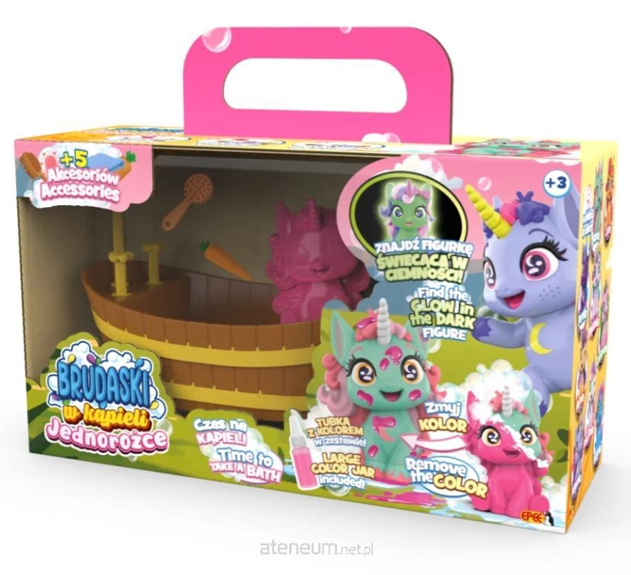 Zawartość opakowania: 1 figurka jednorożca, 1 tubka z różowym błotkiem, 5 akcesorium, 1 wanienka z natryskiem.