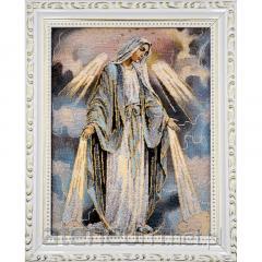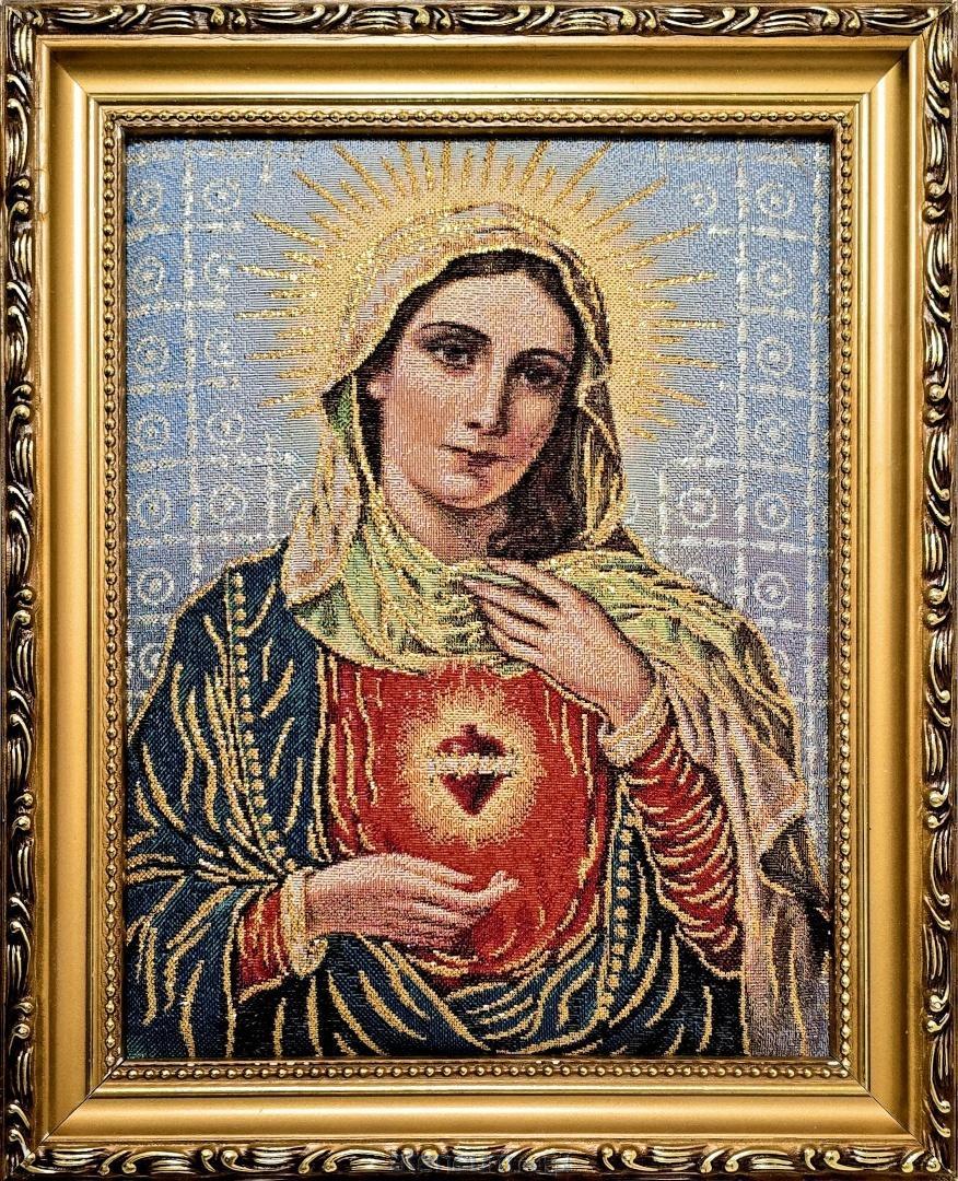 Piękne, nasycone kolory oraz kunsztownie wplecione złote nici nadają wizerunkowi serca wyjątkowego blasku i sakralnej podniosłości. Technika haftu tworzy unikalną, wypukłą fakturę, która ożywia postać Maryi, czyniąc obraz nie tylko przedmiotem kultu, ale i wyrafinowanym dziełem sztuki religijnej. Całość została oprawiona w elegancką, bogato zdobioną złotą ramę o szerokości około 3 cm, która idealnie dopełnia kompozycję.