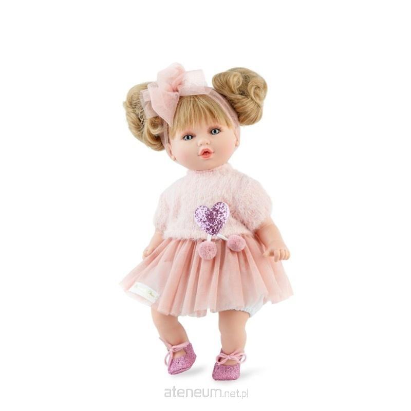 Śliczna 40-cm dziewczynka o imieniu Petite to gwarancja świetnej zabawy. Ubrana we miękki sweterek z błyszczącym serduszkiem i pomponikami oraz różową tiulową spódniczkę. Całość stroju dopełniają białe bawełniane majteczki oraz lśniące wiązane buciki. Lala została zaprojektowana i ręcznie wykonana w Hiszpanii w firmie Marina & Pau. Urzeka słodki wyraz twarzy, blond włosy ozdobione delikatną opaską, zebrane w dwa kucyki oraz niebieskie, ręcznie malowane otwarte oczy opatrzone gęstymi rzęsami. Podkreślone rysy twarzy, wyrzeźbione linie papilarne, malowane lekko otwarte usta czy fałdki pod kolanami sprawiają, że lalka wygląda jak prawdziwa mała dziewczynka.