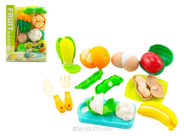 Zestaw warzyw i owoców do krojenia. Najpierw należy obrać produkty ze skórki, łupinki, a następnie je pokroić. W komplecie różne elementy spożywcze oraz akcesoria kuchenne jak: nóż, widelec, talerz, deseczka. Zabawka przeznaczona dla dzieci od lat 3. Zabawka zapakowana w przezroczyste pudełko. Podane wymiary są wymiarami opakowania.