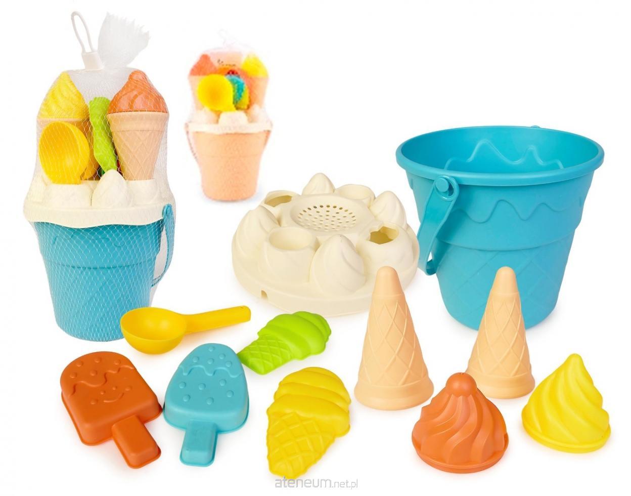 W zestawie: wiaderko, sitko, łopatka, 8 foremek do robienia lodów z piasku; wym. opak.: 17 x 28 cm; pakowane w siatkę; 3+