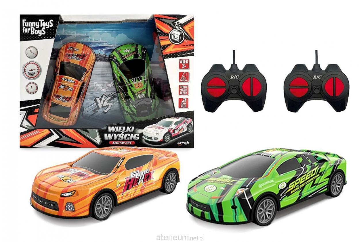 W zestawie: 2 auta wym. 17,5 x 8 x 5 cm, 2 piloty; funkcje: pełny zakres jazdy, działające przednie światła, ustawienie zbieżności kół, gumowe opony; częstotliwość 27 MHZ/40 MHZ; skala 1:24, wym. opak. 30 x 23 x 8 cm; baterie: 6 x AA 1.5 V (auta) niedołączone, 4 x AA 1.5V (piloty) niedołączone, 3+