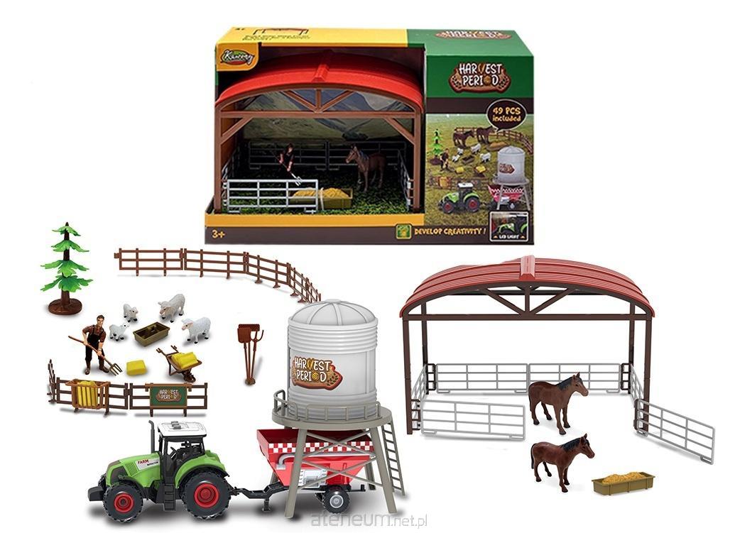 W zestawie: traktor, zadaszona zagroda, 2 konie, 4 owce, figurka rolnika, silos, przyczepa, widły/łopata, taczka, drzewko, pasza/siano, korytko z paszą, elementy ogrodzenia; funkcje: efekty świetlne i dźwiękowe przy traktorze; baterie: 3 x AG13 dołączone; 3+