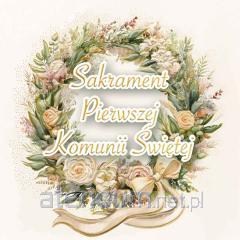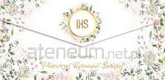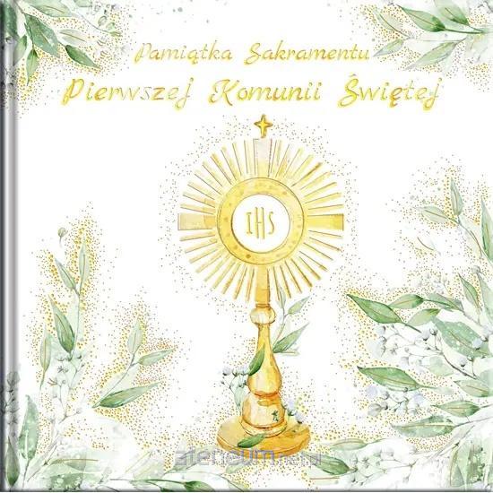 Książeczka Komunijna w formacie 21,5 x 21,5 cm. Oprawa twarda złocona. Autorskie ilustracje, własny dobór tekstów. Książeczka 12-nasto stronicowa z kopertą na pieniążki.